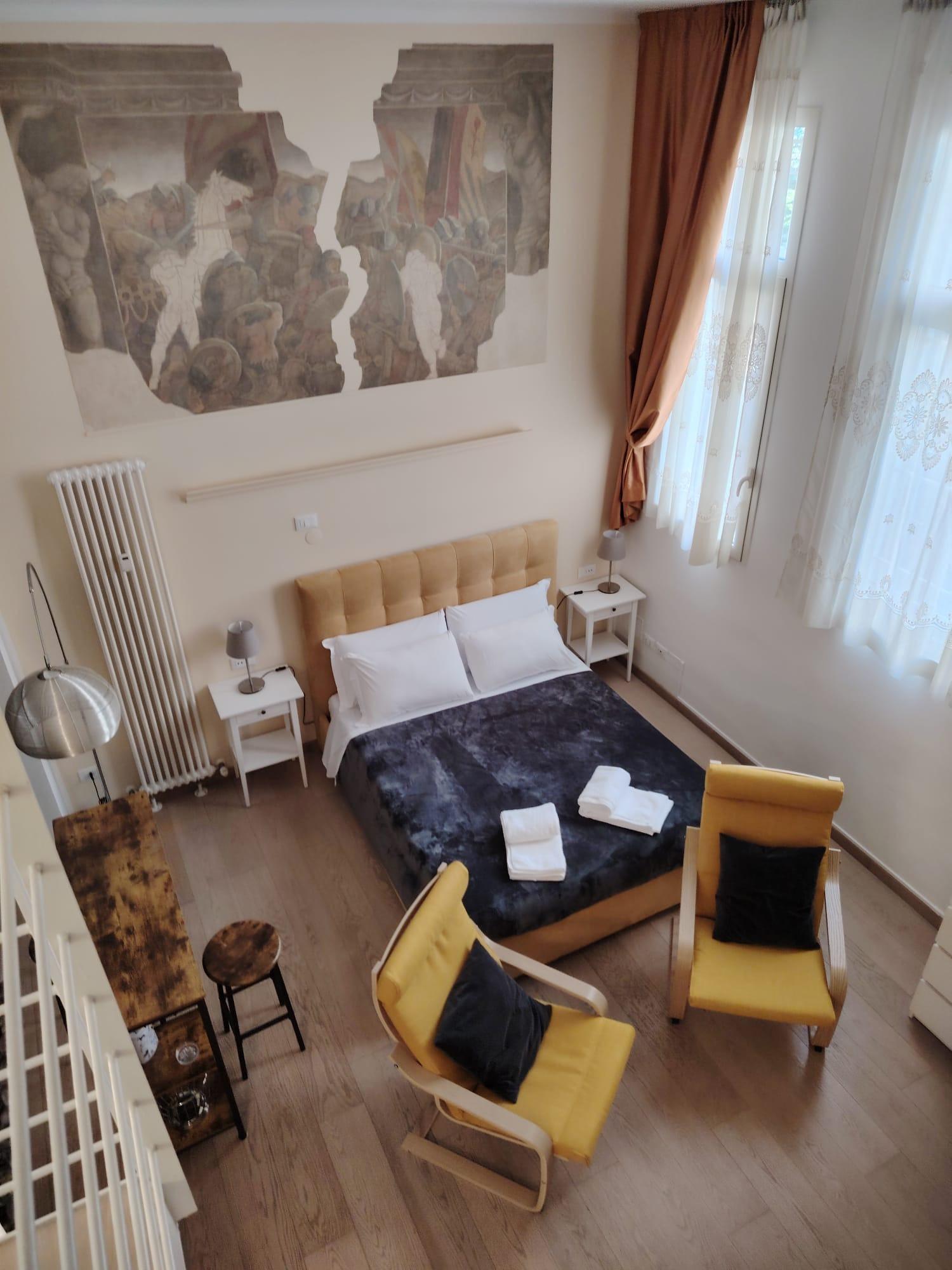 Il soppalco regala uno spazio aggiuntivo, da vivere come angolo lettura, relax o lavoro, secondo le esigenze. Un grande quadro del maestro Ubaldo della Volpe impreziosisce l’ambiente con un tocco d’arte, rendendo l’atmosfera ancora più raffinata e personale.